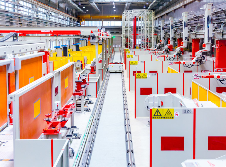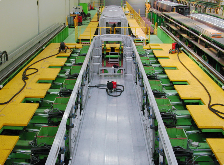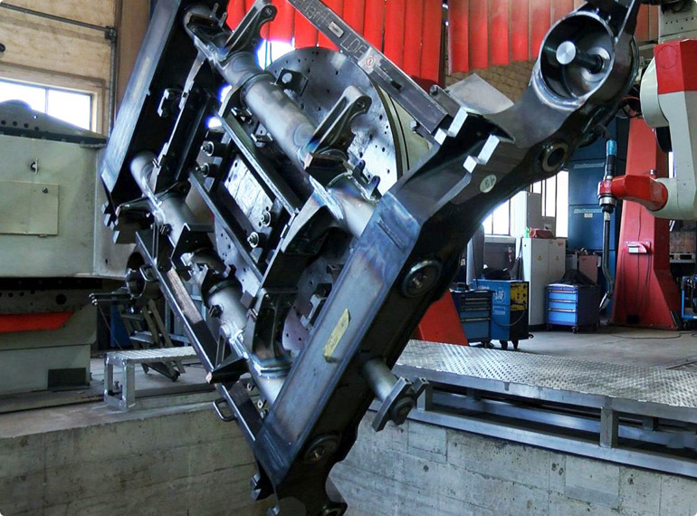 For extreme productivity requirements, automatic fabrication lines are available for main frames. These flexible manufacturing systems (FMS) are designed for the machining of a single workpiece type in multiple identical robot cells. The individual robot welding stations are connected by an automated transport system. The carriage moves on rails and carries a satellite carriage that can move into each station for loading, unloading, preparation and welding. The workpieces are automatically clamped by a special mechanism.
