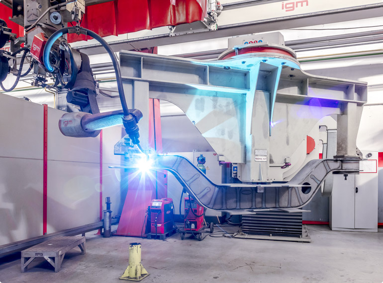More than a dozen different large components for slewing tower cranes, for example slewing platforms or undercarriages for fast-erecting cranes, slewing gear bearings, or slewing ring supports for slewing platforms can be welded by igm welding robots.