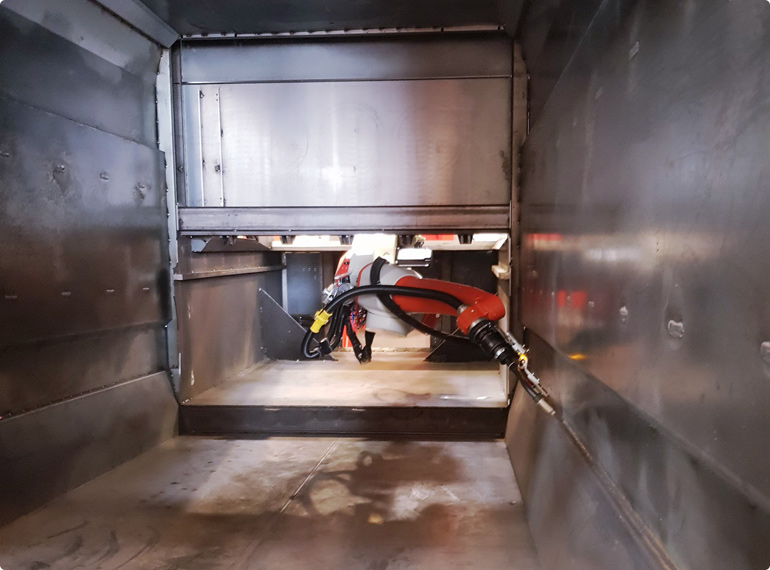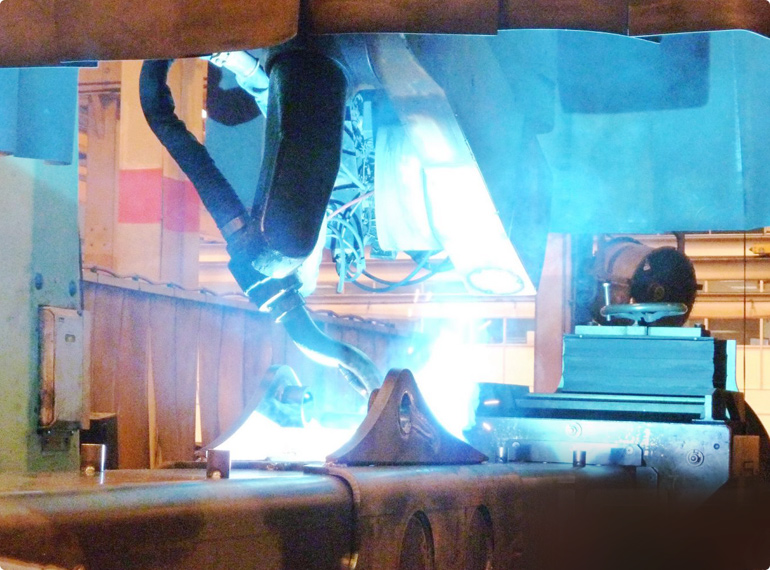 Our installations for the manufacture of excavating machines consist of stand-alone machines or complete production lines with multiple welding cells and systems for automatic loading and unloading. Welding requirements are often demanding due to extreme material thickness, however, our robots are able to cope with position tolerances, seam displacements and welding distortions by means of laser camera systems which allow extremely accurate welding.